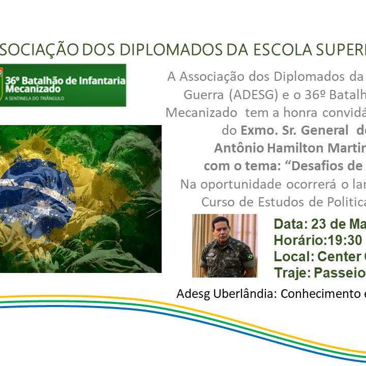 Eduardo Damatta e Eleusa Oliveira – Delegados da ADESG Uberlândia, Diretores e estagiários do XXI CEPE – Turma 2018, convidam para a Sessão Solene de Instalação e Aula Inaugural com o General Umberto Ramos de Andrade – Presidente da ADESG Nacional, com o tema: “O SONHO DE UMA GRANDE NAÇÃO: DESAFIOS E OPORTUNIDADES” Local: Autitório…