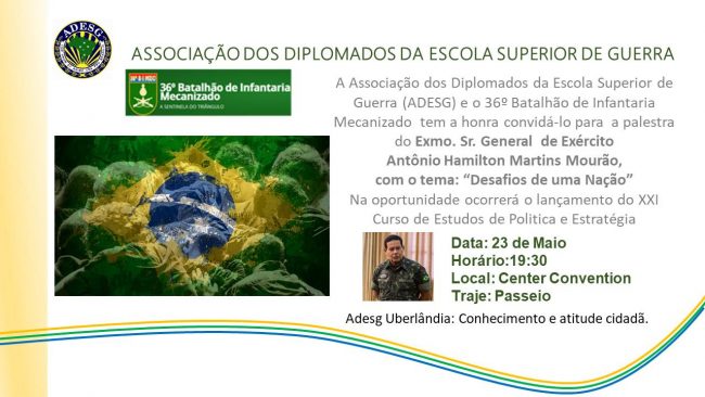 A Associação dos Diplomados da Escola Superior de Guerra (ADESG) e o 36º Batalhão de Infantaria Mecanizado realizarão a Palestra com o Exmo Sr General de Exército ANTÔNIO HAMILTON MARTINS MOURÃO, com o tema: “Desafios de uma Nação”. Na oportunidade ocorrerá o lançamento do XXI Curso de Estudos de Política e Estratégia. Data: 23 de…